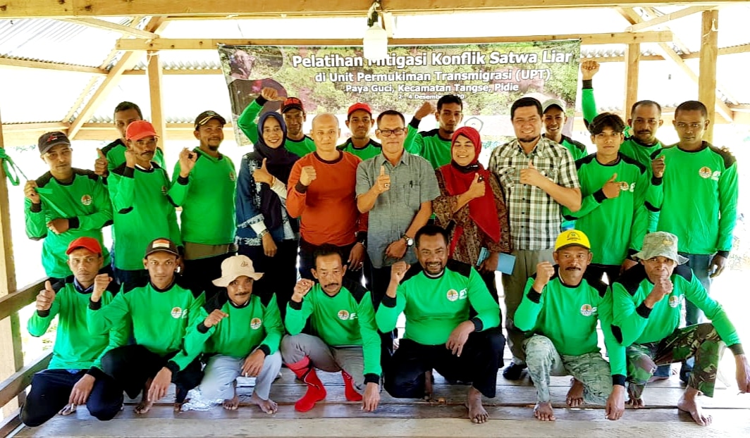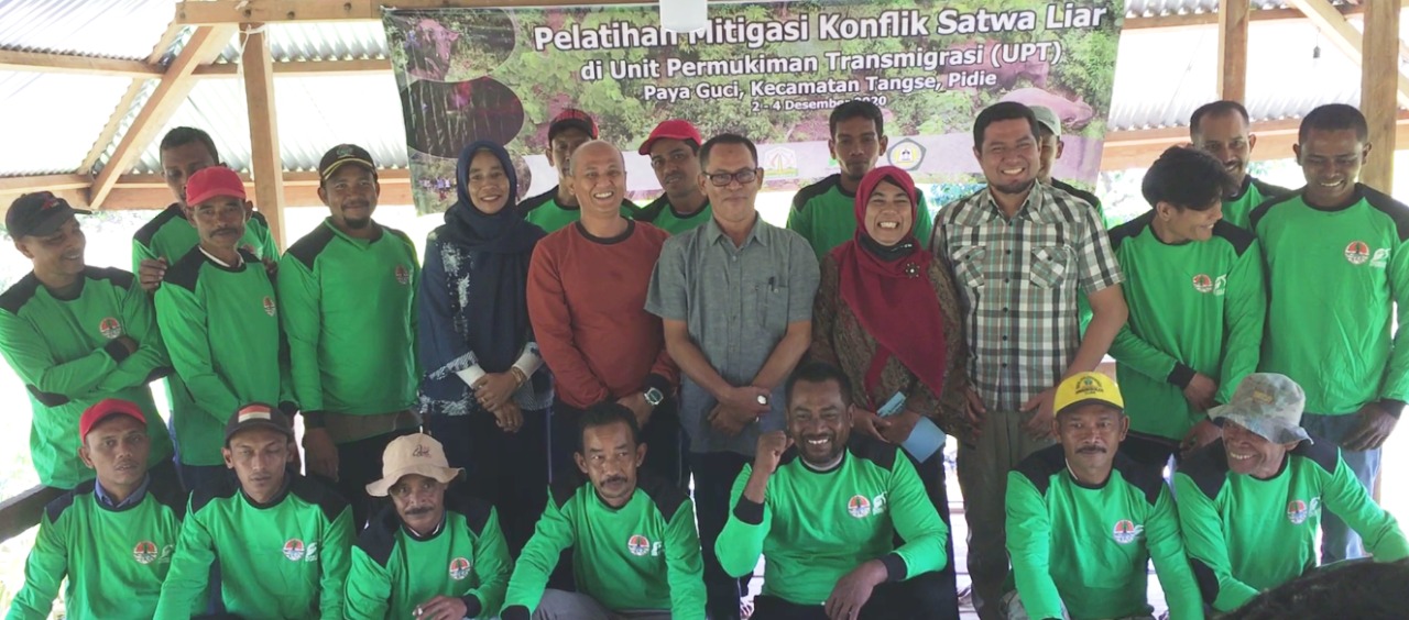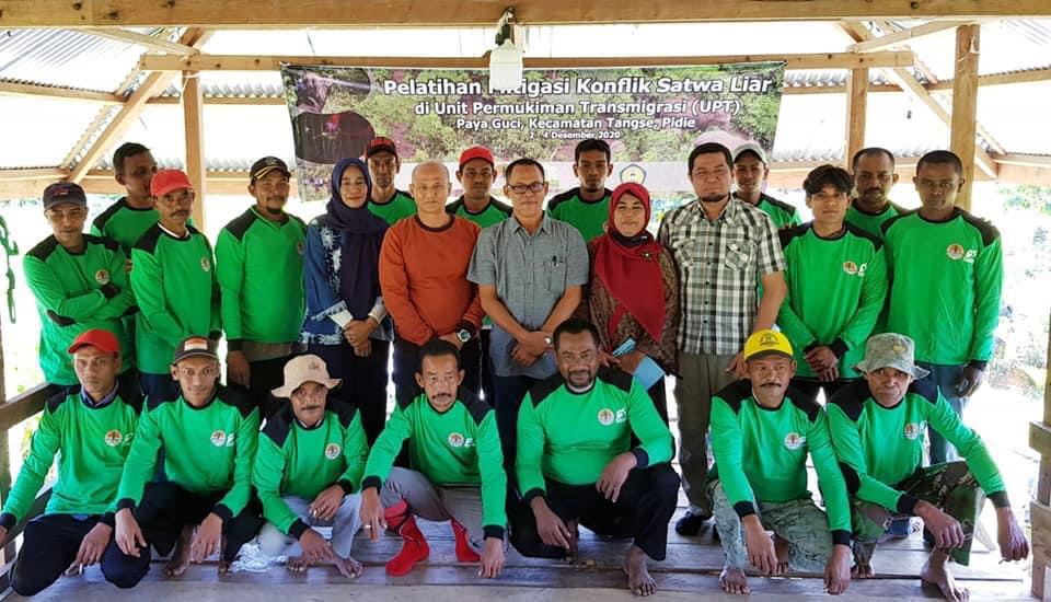 Kelompok yang sudah terbentuk selanjutnya mengikuti pembekalan dan pelatihan mitigasi konflik satwa liar. Dalam rangkaian pelatihan, Kamarudzaman, S.Hut, M.H Sebagai Kepala Seksi Konservasi Wil. I BKSDA Aceh selaku instansi vertikal yang membidangi konservasi satwa liar Kementerian LHK, turut memberikan materi tentang peraturan perundangan dan dinamika satwa liar dengan masyarakat Aceh. Sejak tahun 2017, intensitas konflik Gajah terus meningkat akibat dari habitat yang ter-fragmentasi dan terus semakin menyempit. Sesi ini menyita banyak waktu karena adanya umpan balik dari masyarakat atas pengalaman BKSDA, sehingga sesi saat itu menjadi kualitas. Sedangkan dari LPPM-STIK, Dr. Ir. Cut Maila Hanum M.P menerjemahkan pemahaman tentang saling keterkaitan antara satwa liar, tumbuhan dan masyarakat di sekitarnya. Modal sosial menjadi faktor utama melakukan upaya mitigasi konflik satwa dengan manusia. Adanya saling menjaga, membatasi serta mengutamakan kerjasama kelompok dalam penanggulangan dan penanganan gangguan satwa liar adalah prinsip. Di akhir sesi, FFI dengan tim Teresterial memberikan paparan tentang etika dan kode etik penghalauan dan penggiringan Gajah liar. Sesi ini banyak menghabiskan waktu untuk melakukan simulasi lapangan bagaimana penghalauan dan bagaimana penggiringan Gajah liar.